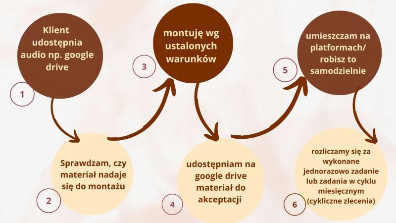 Poniżej przykładowa ścieżka nawiązywania współpracy przy montażu odcinków podcastu/ audycji. Sposób współpracy zależny jest od Twoich potrzeb i do każdego klienta podchodzę indywidualnie.